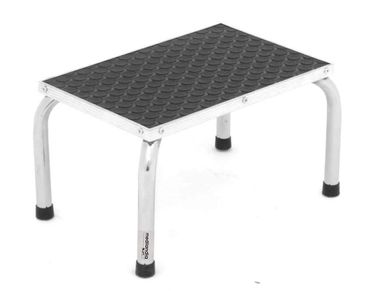 Banco de un peldaño, cubierto de hule sintetico negro, antidherrapante. con estructura de tubo redondo de 1" de diametro. acabado cromado. facil de almacenar.